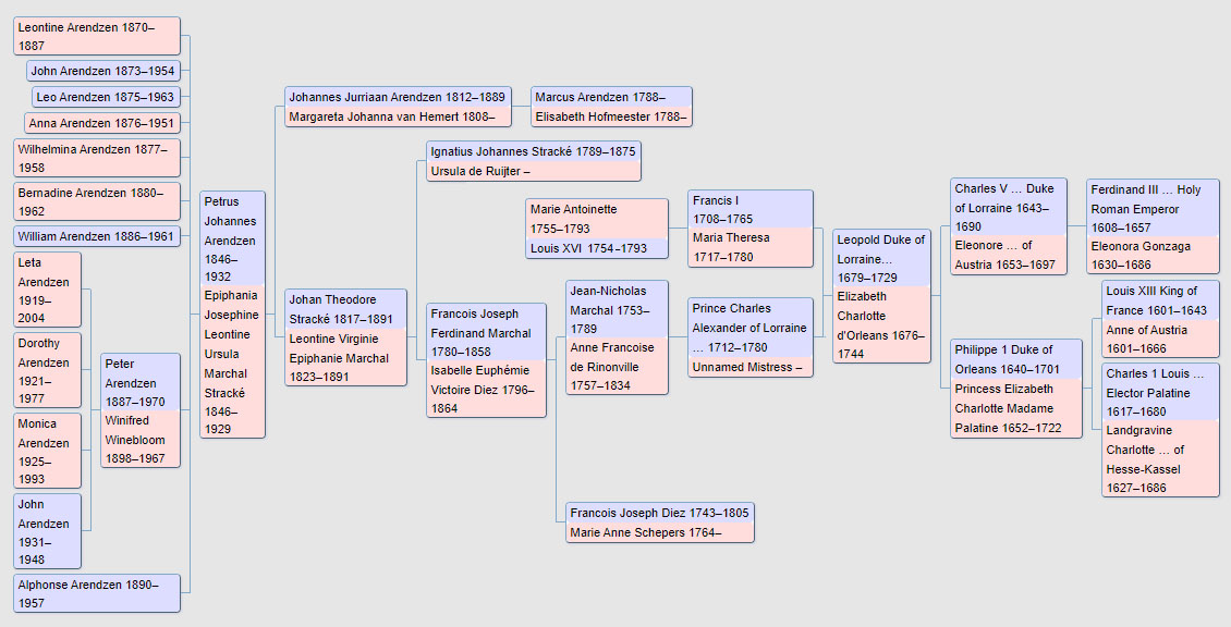 The Arendzens had always claimed a connection with French nobility (usually citing Marie-Antoinette) and there appears to be a line of descent that can be traced back to King Louis XIII of France, Ferdinand III of Germany and beyond. The connection to Marie-Antoinette would have been her uncle, Charles Alexander of Lorraine. Anne Françoise de Rinonville and Marie-Antoinette were cousins.